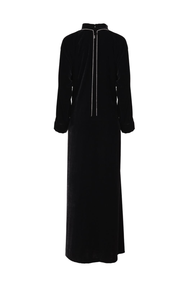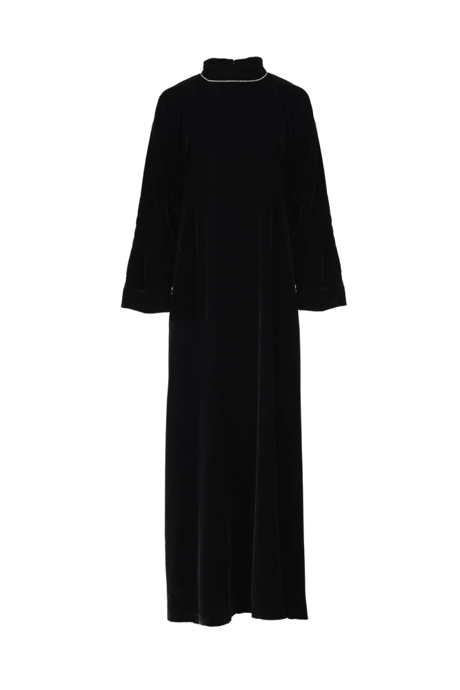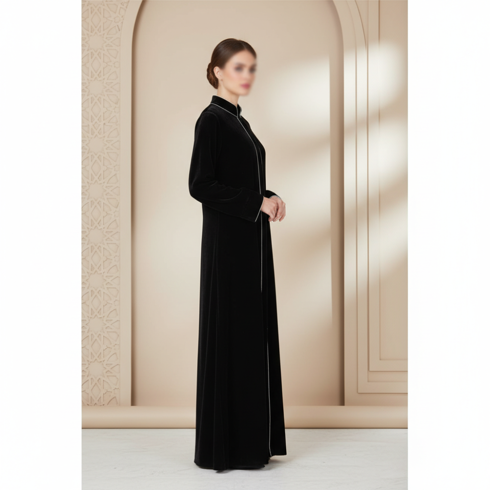 جلابية مخمل اسود فاخرة وأنيقة، تصميمها الأسود الكلاسيكي مع خامة مخمل ناعمة وأكمام طويلة وياقة مرتفعة تمنحك دفء وإطلالة راقية تناسب جميع المناسبات