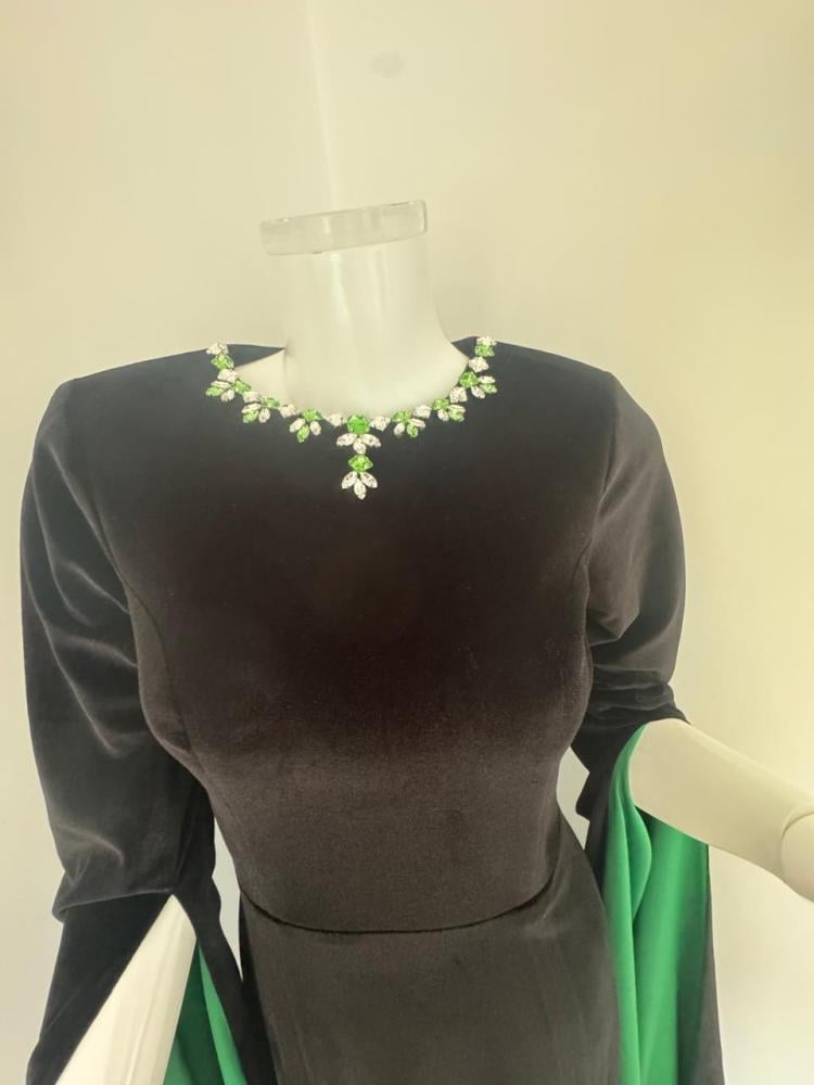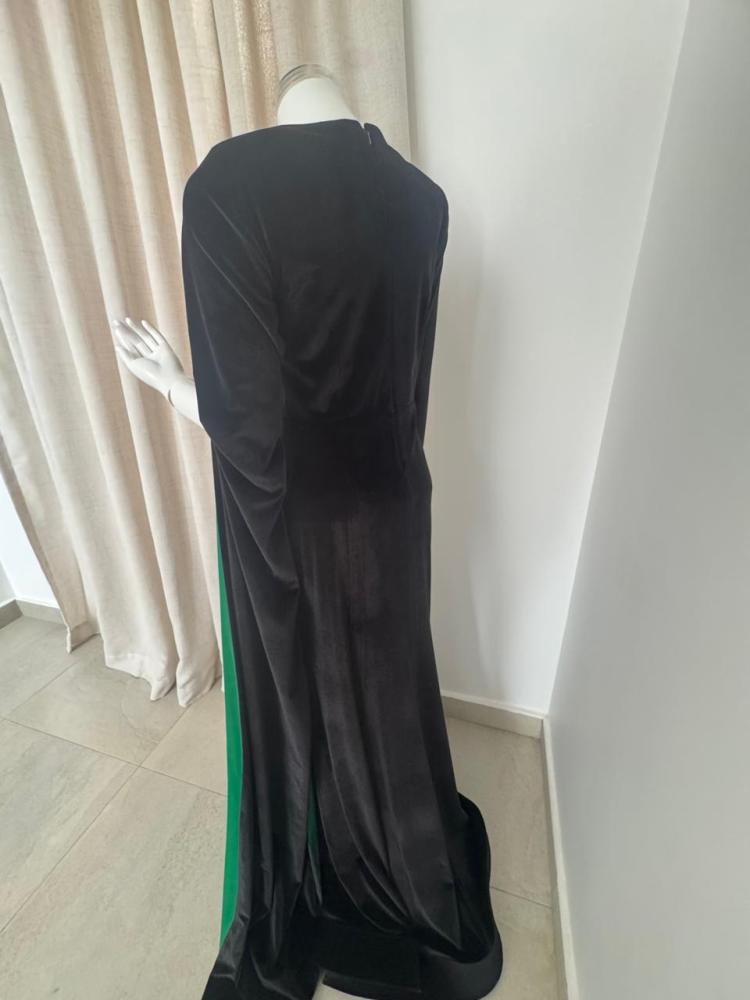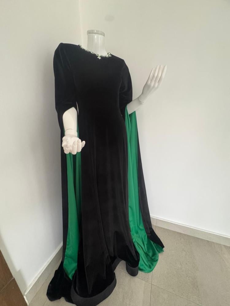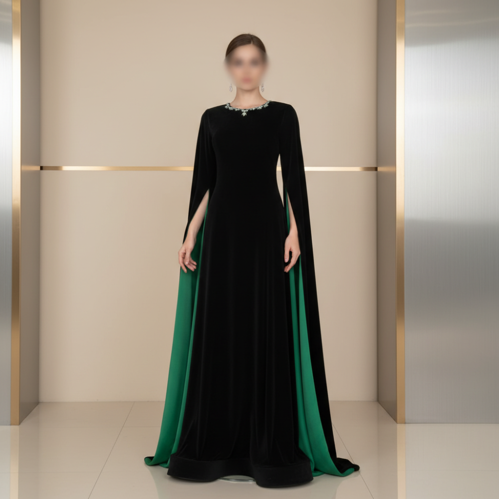 فستان اسود مخمل طويل فاخر وأنيق، بتصميم كلاسيكي أسود مع كاب مدمج وتطريز كريستالي يضفي لمسة ملكية وفخامة مثالية للمناسبات الرسمية وحفلات العشاء
