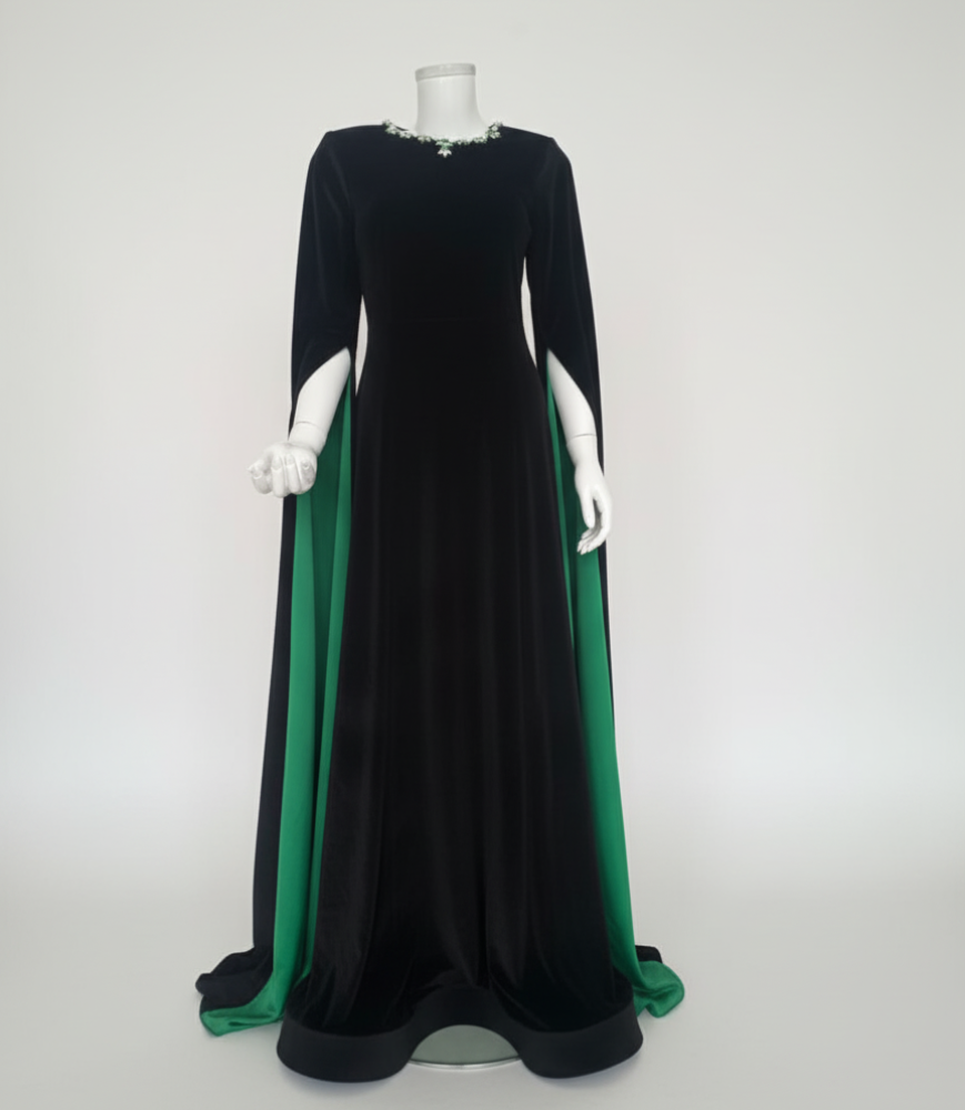 - التصميم: فستان سهرة طويل ضيق (قصة عمودية) مع كاب طويل يغطي الأكتاف والذراعين